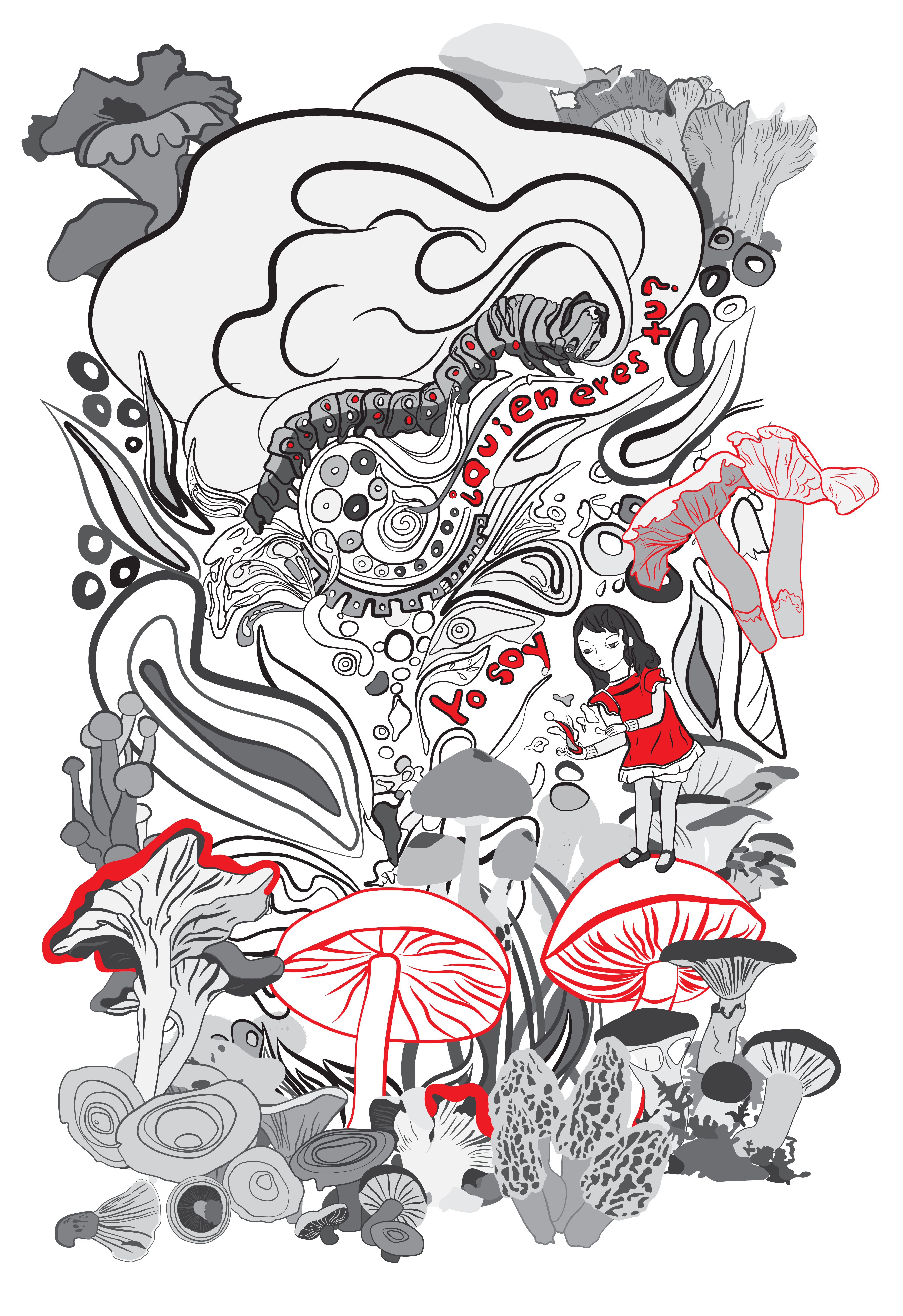 Based on one of my paintings that was lost in San Francisco. I added mushrooms and like the new version best! Gardening has been my form of meditation since I was nine years old; this illustration references childhood imagination, existentialism and my love of Alice in Wonderland. When I am in my element designing, photographing and gardening — I am fully engrossed in the present and forget the ego. As an empath a creative outlet allows me to live in the moment. The caterpillar asks "¿Quien eres tu?"
